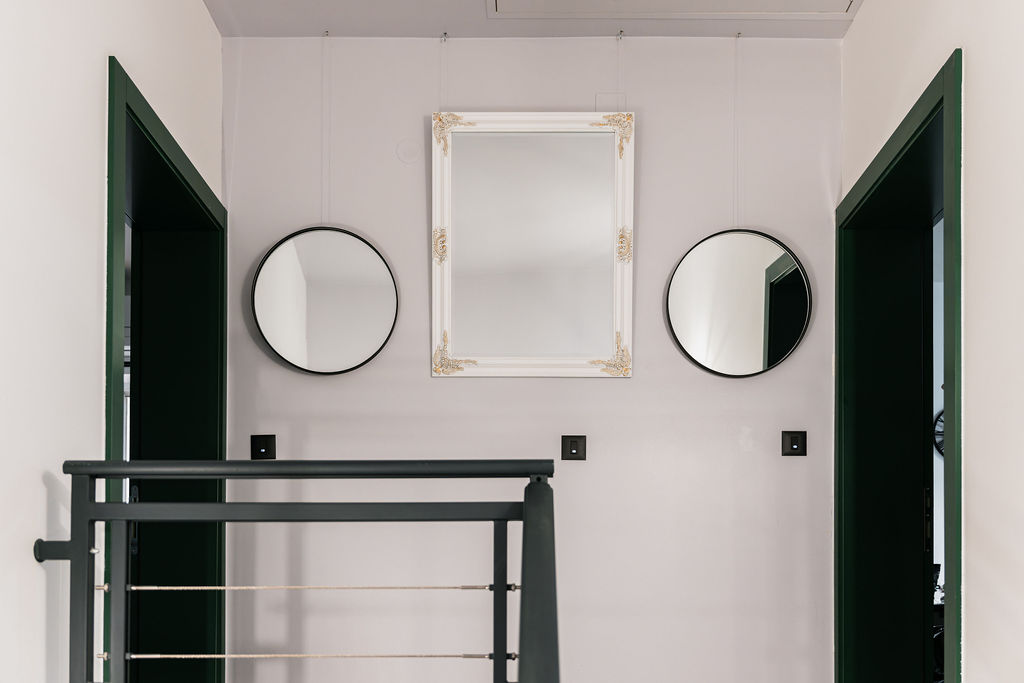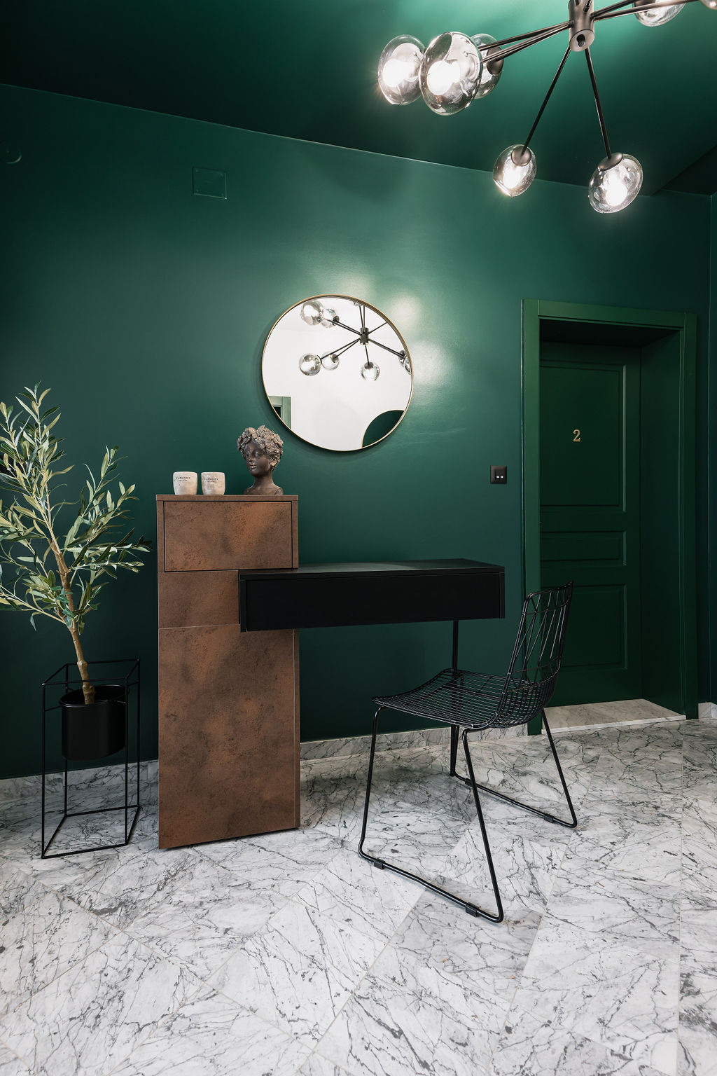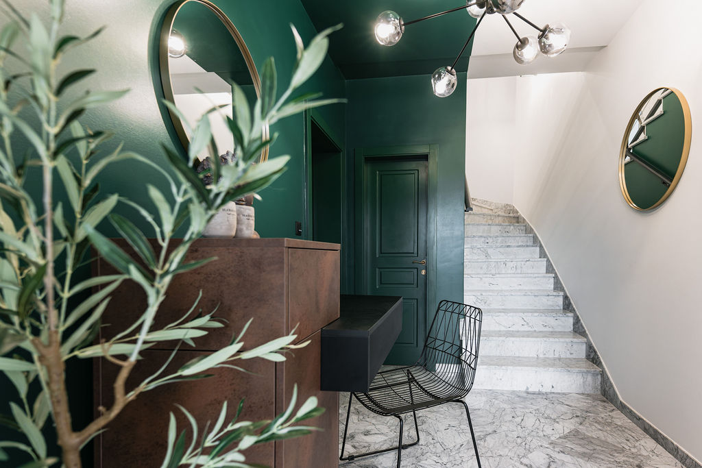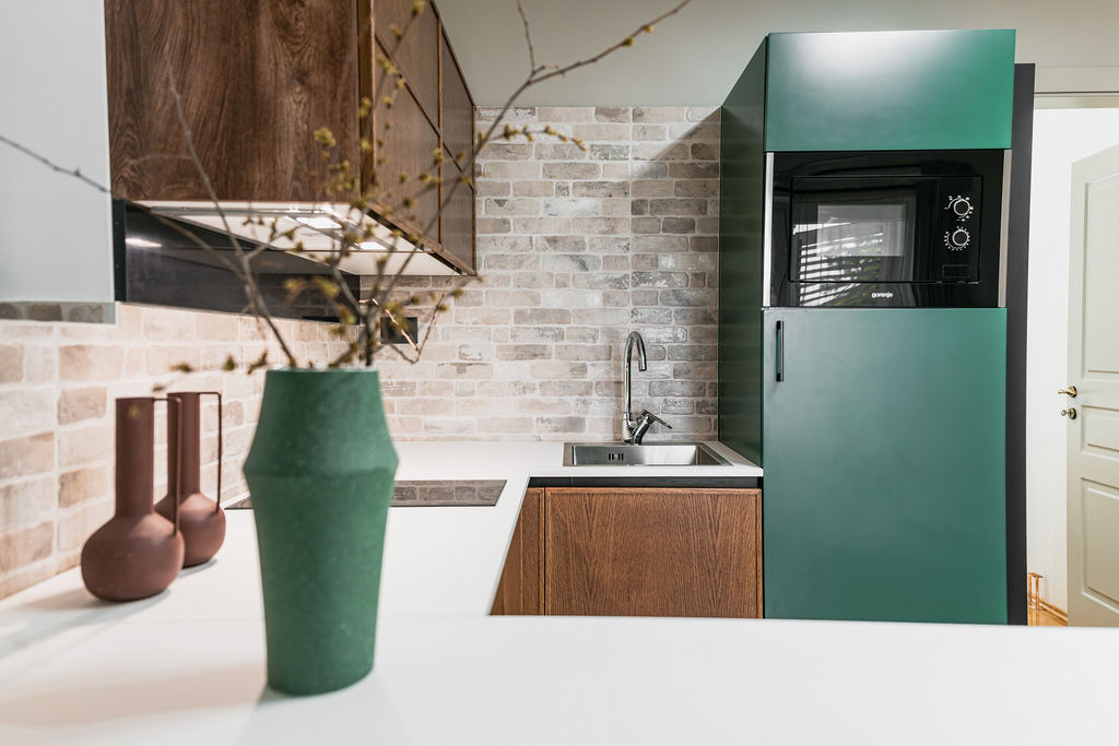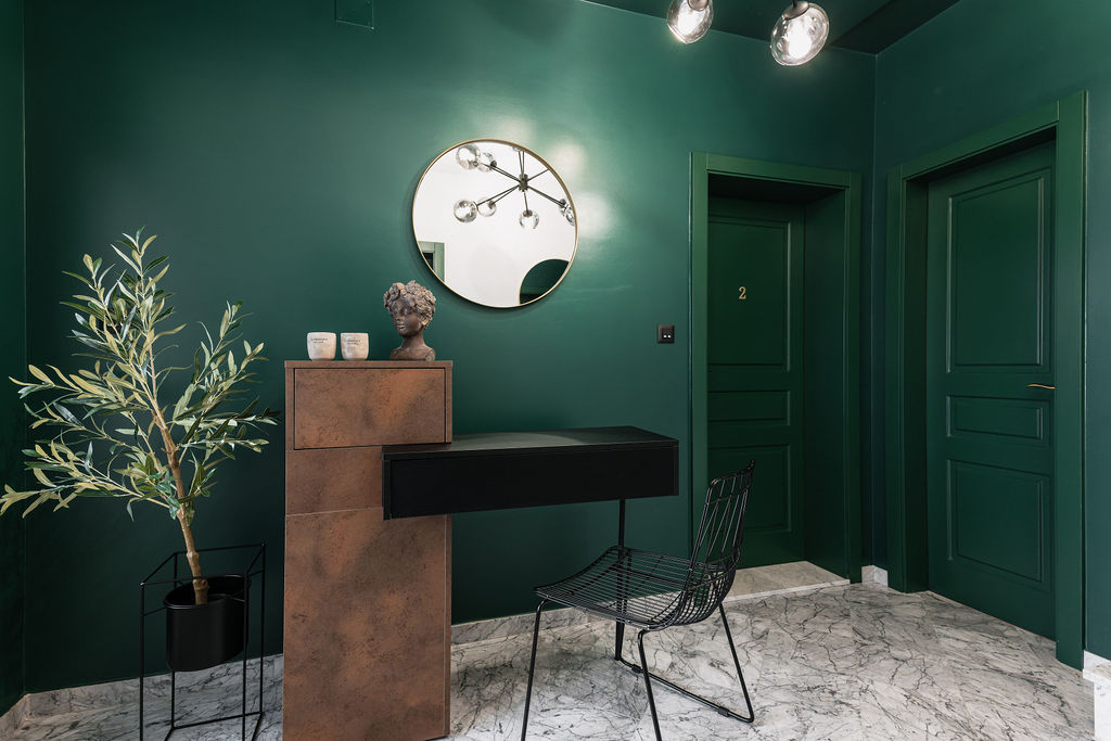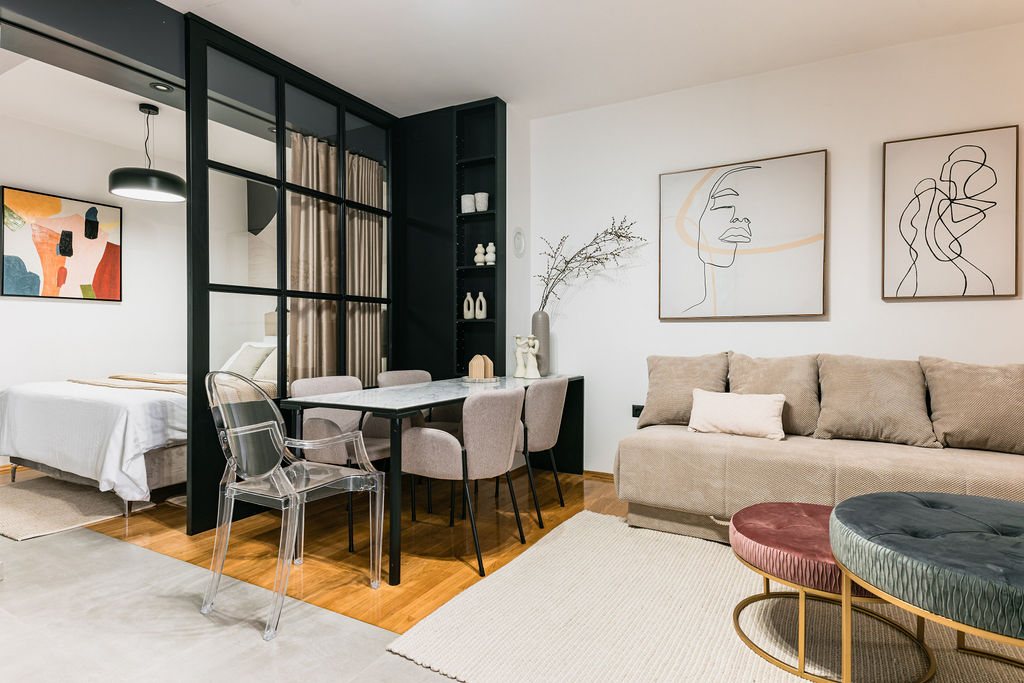This thoughtfully designed apartment offers a gallery-inspired atmosphere with modern furniture and sculptural details, creating a stylish yet welcoming space ideal for couples and families of up to four guests. The bedroom features a comfortable queen bed surrounded by calming neutral tones and soft lighting, providing a serene setting for rest. In the living room, a green sofa, round coffee tables, and curated décor elements add character and warmth.