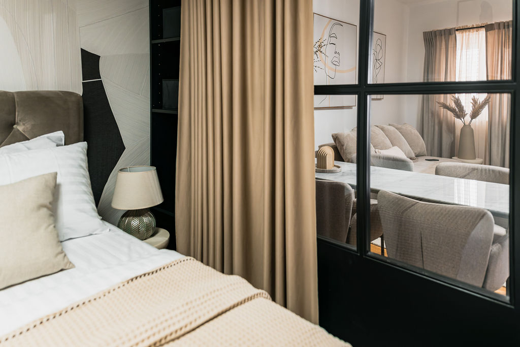 This apartment combines an elegant, urban–heritage ambiance with Mediterranean details, making it an excellent choice for business travelers and design enthusiasts. The bedroom features a queen bed framed by textured wall panels, creating a sophisticated and restful space.