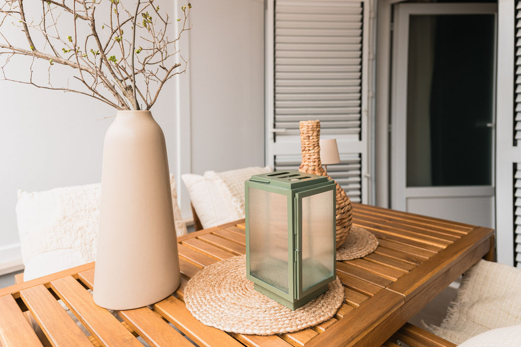 This boutique accommodation offers a warm, natural look with a calming palette of beige, sand, and wood complemented by green accents, creating an inviting atmosphere ideal for couples and longer stays. The bedroom features a comfortable queen bed with an upholstered headboard, blackout curtains for restful sleep, and a dedicated work corner or vanity desk for added convenience.