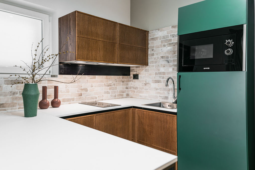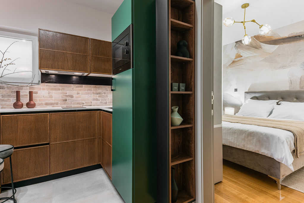 An elegant heritage meets Mediterranean feel, creating a refined choice for business travellers and design lovers. The bedroom features a queen bed complemented by textured wall panels, while the generous living room is defined by a deep green sofa and an art mural that sets the tone. A darker toned kitchen with stone and metal finishes connects seamlessly to a dining space for four, offering both function and style. The bathroom is designed with large tiles, a walk-in shower, and matte black fittings that emphasize modern sophistication. Extending the living area, a large covered terrace provides panoramic views over the inlet and surrounding hills, functioning as an outdoor living room. Statement murals, comfortable armchairs, and atmospheric lighting highlight the space, balancing design flair with everyday comfort.